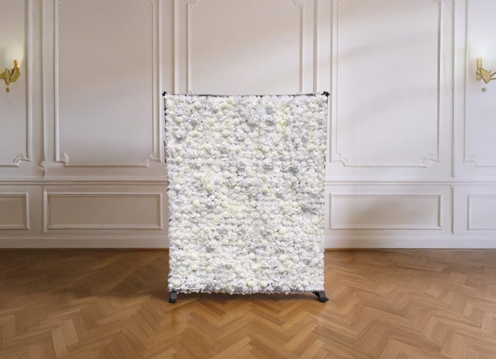 Blumenwand Komplettansicht Die komplette Ansicht unserer eleganten weißen Blumenwand für Hochzeiten